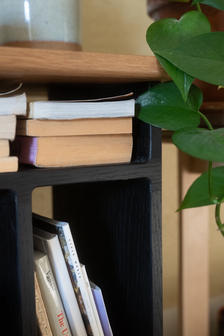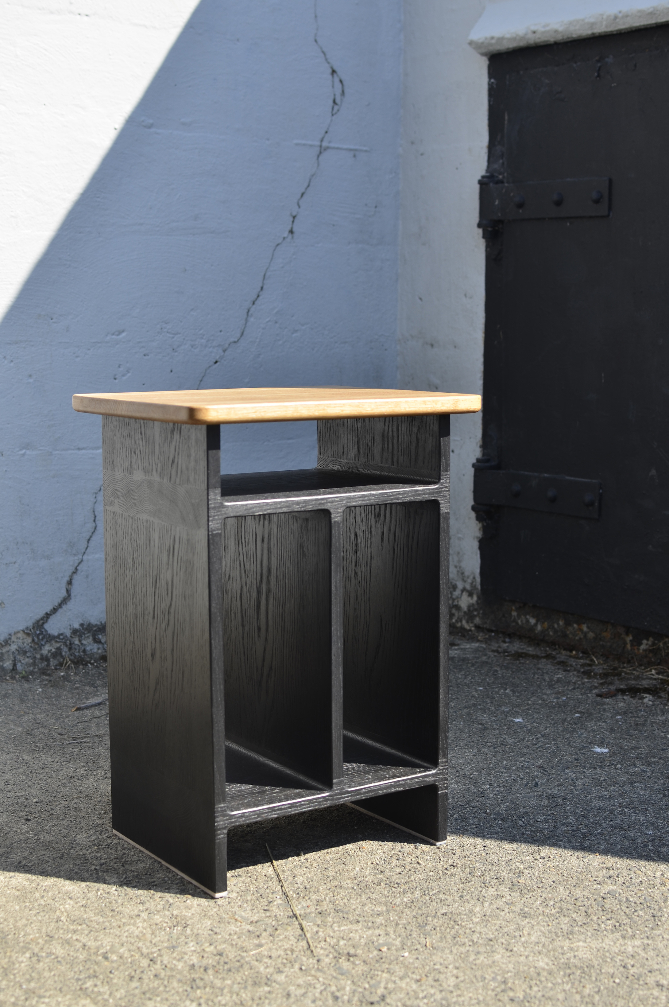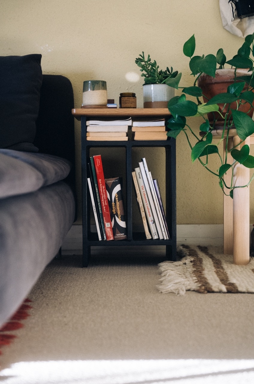 Side table that’s made to sit neatly beside your couch or reading chair with integrated book storage, taking on the form of cinder building blocks, echoing the potential of growth.